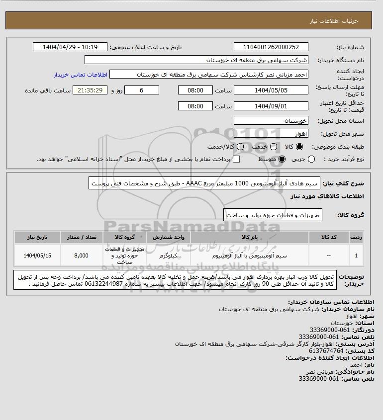 1 | -- | سیم آلومینیومی یا آلیاژ آلومینیوم | کیلوگرم | تجهیزات و قطعات حوزه تولید و ساخت | 8,000 | 1404/05/15 |
