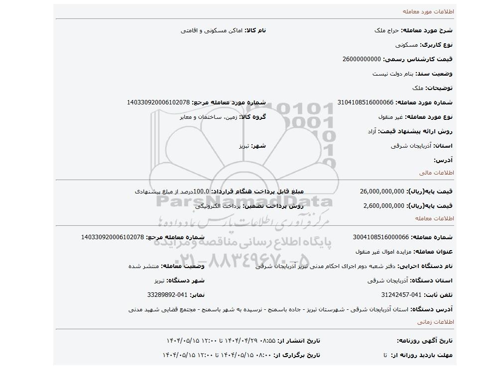 9 مزایده دستور فروش ملک مشاعی 9810687 1404/08/15 new not special not payed آذربایجان شرقی