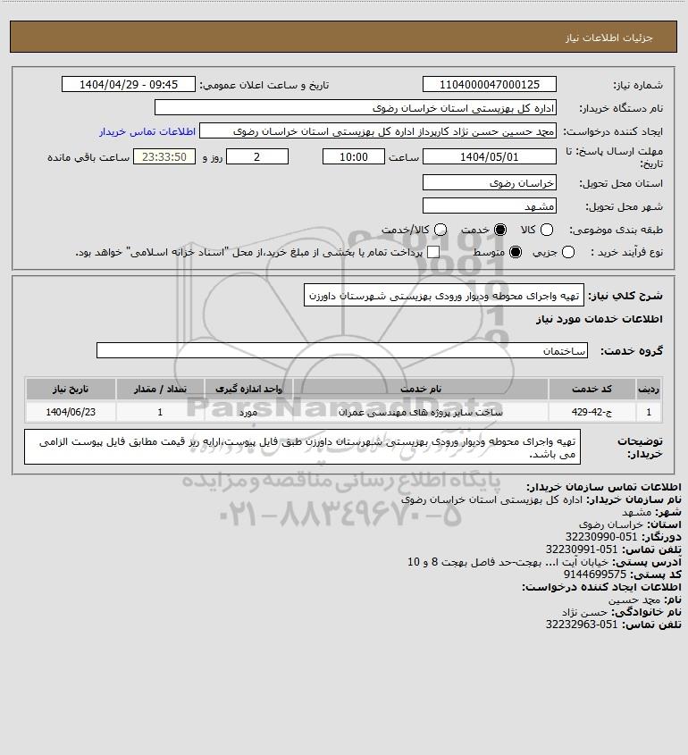 شرح کلی نیاز: تهیه واجرای محوطه ودیوار ورودی بهزیستی شهرستان داورزن