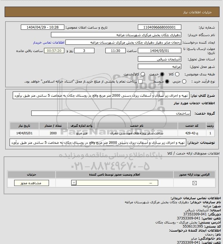 استعلام تهیه و اجرای زیر سازی و آسفالت ریزی دستی 2000 متر مربع واقع در روستای چکان به ضخامت 5 سانتی متر طبق برآورد, استعلام تهیه و اجرای زیر سازی و آسفالت ریزی دستی 2000 متر مربع واقع در روستای چکان به ضخامت 5 سانتی متر طبق برآورد