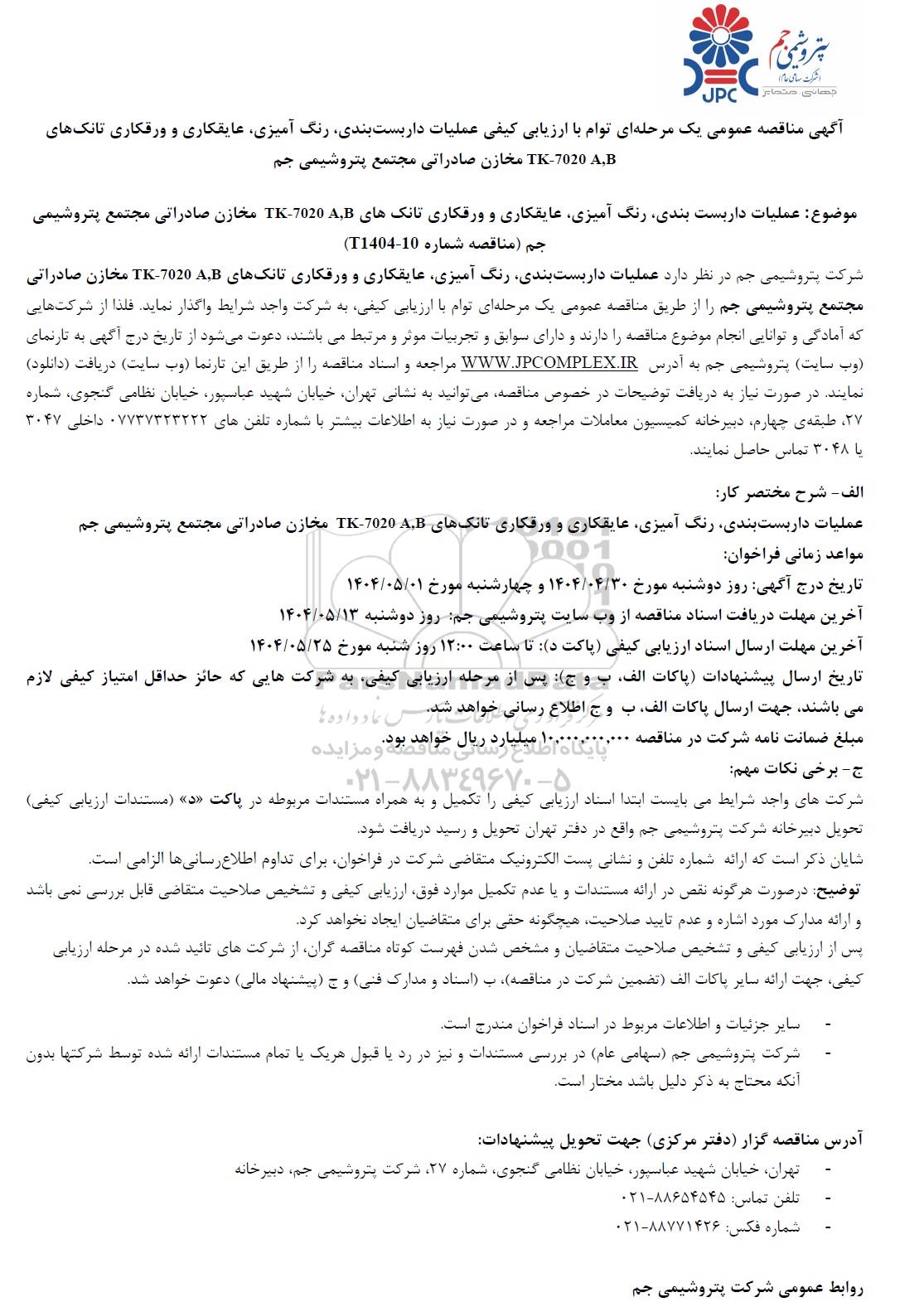 شرکت پتروشیمی جم در نظر دارد عملیات داربست بندی، رنگ آمیزی، عایقکاری و ورقکاری تانک های TK-7020 A,B مخازن صادراتی مجتمع پتروشیمی جم را از طریق مناقصه عمومی یک مرحله ای توام با ارزیابی کیفی، به شرکت واجد شرایط واگذار نماید. فلذا از شرکت هایی که آمادگی و توانایی انجام موضوع مناقصه را دارند و دارای سوابق و تجربیات موثر و مرتبط می باشند، دعوت می شود از تاریخ درج آگهی به تارنمای (وب سایت) پتروشیمی جم به آدرس WWW.JPCOMPLEX.IR مراجعه و اسناد مناقصه را از طریق این تارنما (وب سایت) دریافت (دانلود) نمایند. در صورت نیاز به دریافت توضیحات در خصوص مناقصه، می توانید به نشانی تهران، خیابان شهید عباسپور، خیابان نظامی گنجوی، شماره 27، طبقه ی چهارم ، دبیرخانه کمیسیون معاملات مراجعه و در صورت نیاز به اطلاعات بیشتر با شماره تلفن های 07737323222 داخلی 3047 یا 3048 تماس حاصل نمایند.