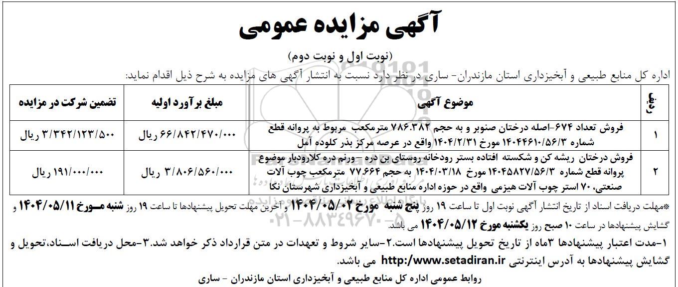 اداره کل منابع طبیعی و آبخیزداری استان مازندران ساری در نظر دارد نسبت به انتشار آگهی های مزایده به شرح ذیل اقدام نماید: