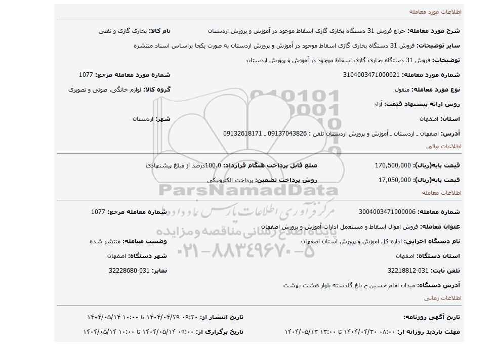| عنوان معامله: فروش اموال اسقاط و مستعمل ادارات آموزش و پرورش اصفهان | ||