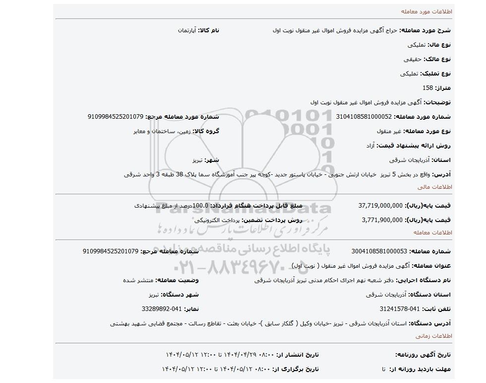 | شماره مورد معامله: 3104108581000052 | شماره مورد معامله مرجع: 9109984525201079 | |
