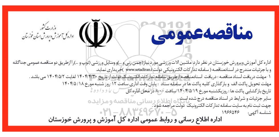 اداره کل آموزش و پرورش خوزستان در نظر دارد ماشین الات ورزشی مورد نیاز (چمن زنی و ...) و وسایل ورزشی (توپ و ...) را از طریق دو مناقصه عمومی جداگانه