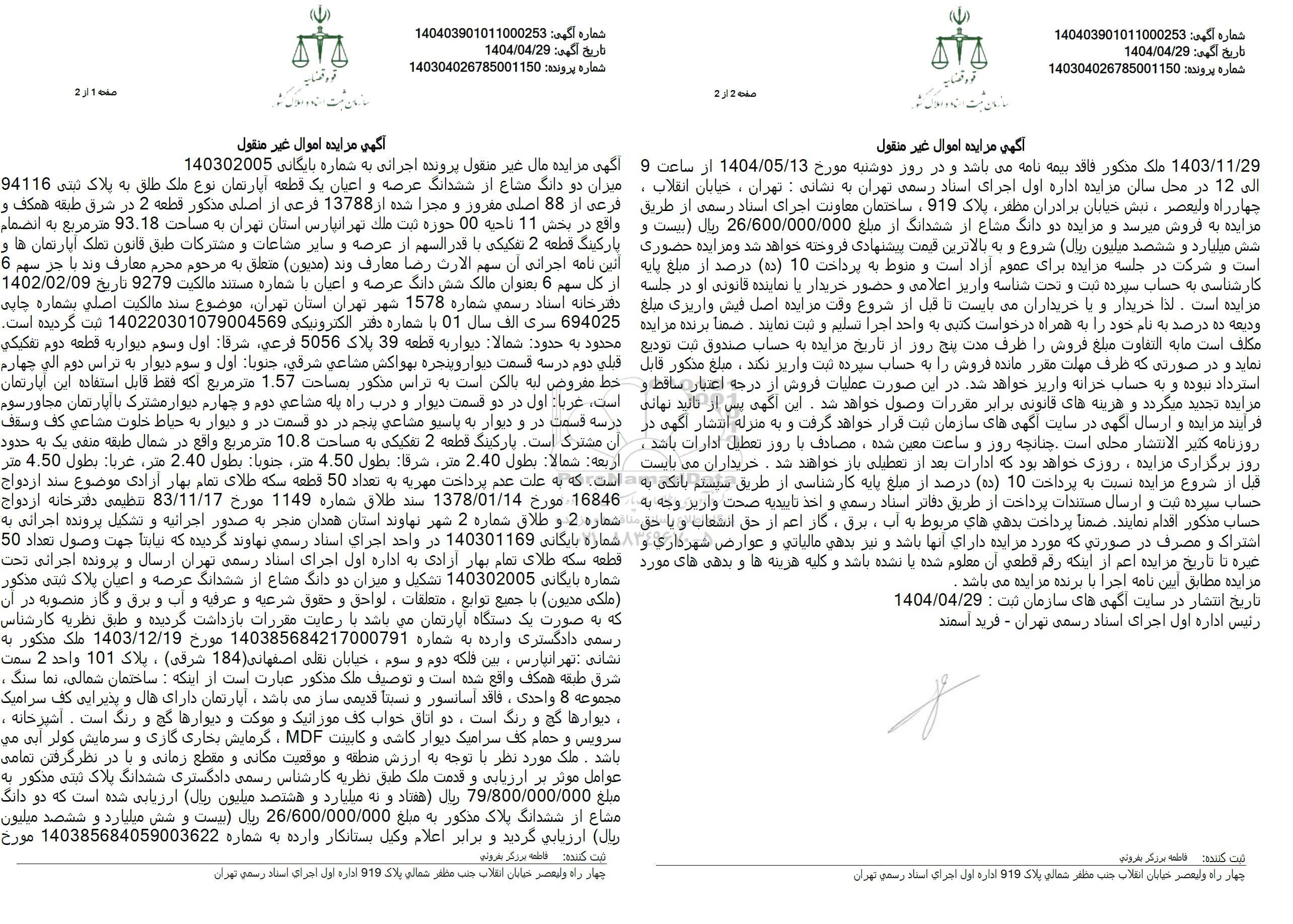 مزایده فروش دو دانگ از ششدانگ یک قطعه آپارتمان با پلاک ثبتی 94116 فرعی از 88 اصلی