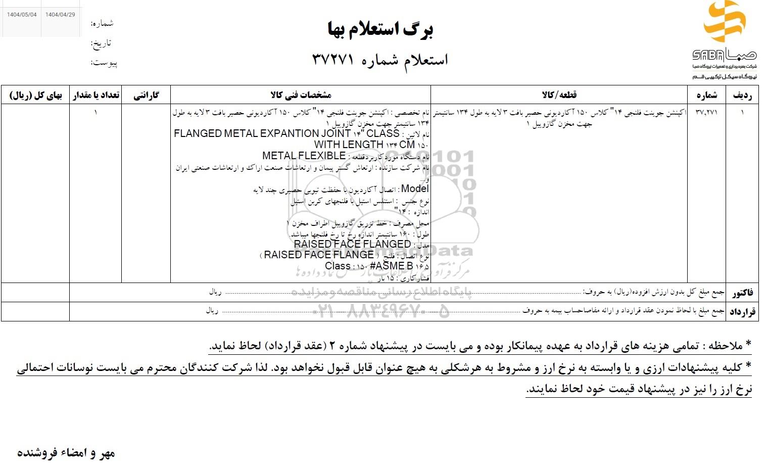 استعلام بها و موضوع استعلام استعلام اکپنشن جوینت فلنجی 14" کلاس 150 آکاردیونی حصیر... به اطلاع کلیه شرکتها و افراد متخصص واجد شرایط میرساند، آگهی گذار در نظر دارد از طریق استعلام بها، نسبت به انتخاب و دریافت پیشنهادات اقدام نماید. این استعلام با کد آگهی ثبت شده در سامانه خبرگزاری پارس نماد : 9297149 منتشر شده است. مشخصات استعلام : تاریخ شروع استعلام: 1404/04/29 آخرین مهلت ارسال پیشنهاد قیمت : 1404/05/04 و محل اجرای پروژه : استان قم میباشد. استعلام قیمت مورد درخواست : استعلام اکپنشن جوینت فلنجی 14" کلاس 150 آکاردیونی حصیر... با دستهبندیهای تخصصی و گروه های مرتبط : قطعات لاستیکی, لوله و اتصالات, مخازن, نیروگاه, تجهیزات برق و الکترونیک, استعلام اطلاع رسانی میگردد. شرایط شرکت در استعلام آنلاین : ابتدا ثبت نام در سامانه استعلام پارس نماد و تکمیل مدارک موردنیاز و بارگذاری در سامانه رعایت تمامی ضوابط و الزامات مندرج در اسناد استعلام است.