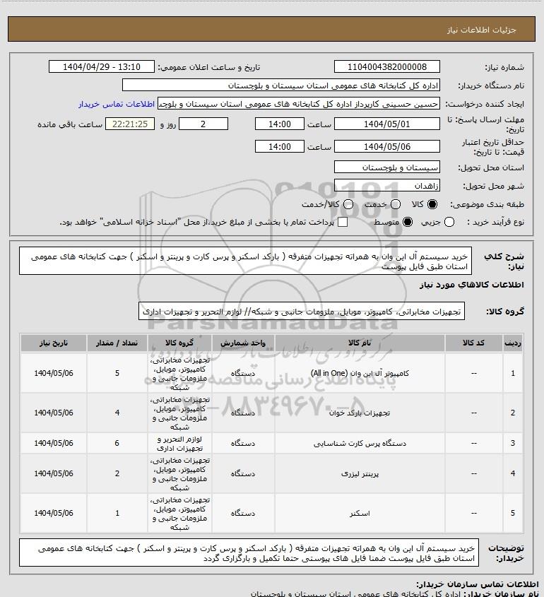 | 1 | -- | کامپیوتر آل این وان (All in One) | دستگاه | تجهیزات مخابراتی، کامپیوتر، موبایل، ملزومات جانبی و شبکه | 5 | 1404/05/06 |