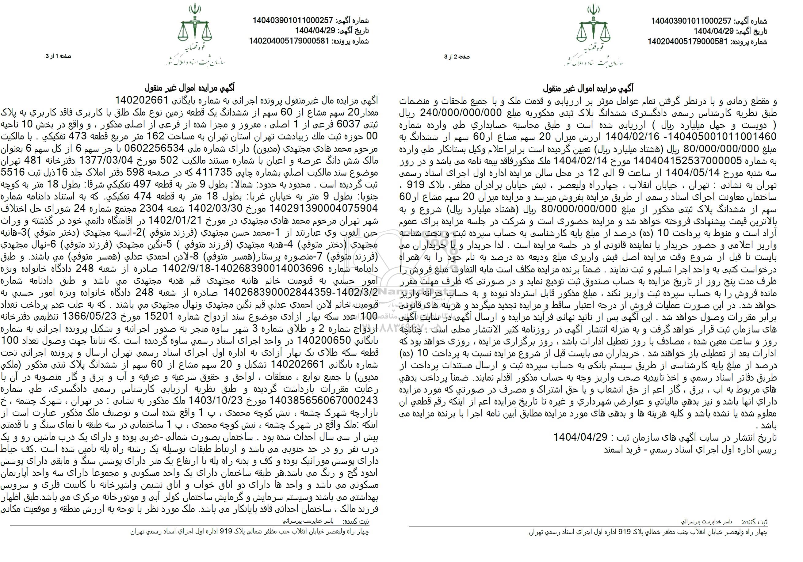 موضوع مزایده : یک قطعه زمین به پلاک ثبتی 6037 فرعی از یک اصلی مفروز و مجزی شده از فرعی از اصلی مذکور به ارزش 80.000.000.000 ریال