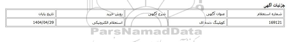 | 169121 | کوپلینگ دنده ای | استعلام الکترونیکی | 1404/04/29 |