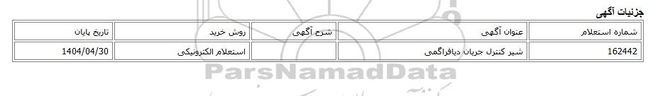 | 162442 | شیر کنترل جریان دیافراگمی | استعلام الکترونیکی | 1404/04/30 |