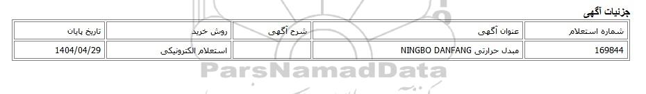 | 169844 | مبدل حرارتی NINGBO DANFANG | استعلام الکترونیکی | 1404/04/29 |