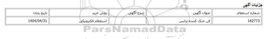 | 162773 | فن خنک کننده ترانس | استعلام الکترونیکی | 1404/04/31 |
