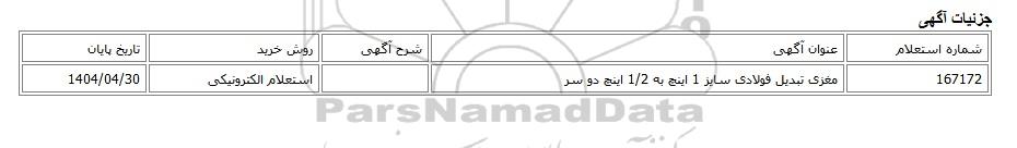 | 167172 | مغزی تبدیل فولادی سایز 1 اینچ به 1/2 اینچ دو سر | استعلام الکترونیکی | 1404/04/30 |