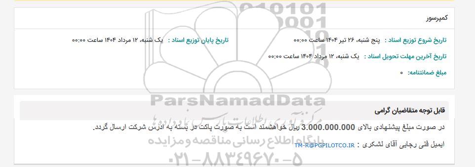 استعلام بها و موضوع استعلام استعلام کمپرسور به اطلاع کلیه شرکتها و افراد متخصص واجد شرایط میرساند، آگهی گذار در نظر دارد از طریق استعلام بها، نسبت به انتخاب و دریافت پیشنهادات اقدام نماید. این استعلام با کد آگهی ثبت شده در سامانه خبرگزاری پارس نماد : 9298380 منتشر شده است. مشخصات استعلام : تاریخ شروع استعلام: 1404/04/28 آخرین مهلت ارسال پیشنهاد قیمت : 1404/05/12 و محل اجرای پروژه : استان سایر میباشد. استعلام قیمت مورد درخواست : استعلام کمپرسور با دستهبندیهای تخصصی و گروه های مرتبط : کمپرسورهای هوا, کلیه خدمات و تجهیزات پروژه های دریایی-اسکله،موج شکن ، مشاوره سازه های دریایی -, تجهیزات و ماشین آلات صنعتی, استعلام اطلاع رسانی میگردد.