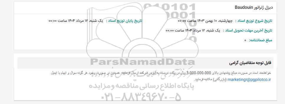 خواهشمند است در صورت مبالغ پیشنهادی بالای 3.000.000.000 ریال در پاکت دربسته به آدرس شرکت ارسال فرمایید. همچنین در صورت وجود هر گونه سوال و ابهام با ایمیل marketing1@pgpilotco.ir (بازرگانی) مکاتبه فرمایید