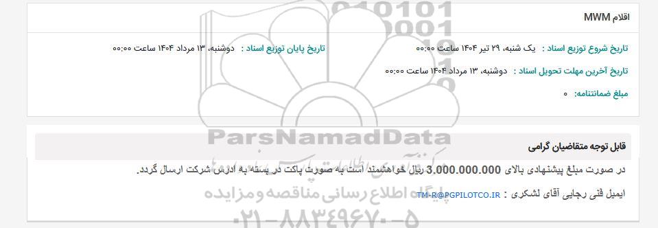 در صورت نیاز به دریافت راهنمایی یا پشتیبانی در خصوص استعلام و مناقصه و فراخوان مناقصه عمومی، مناقصه محدود، مناقصه بین‌ المللی، مناقصه دولتی، مناقصه خصوصی، مناقصه آنلاین فروش تجهیزات، مناقصه مشاوره‌ای مناقصه پتروشیمی و انرژی مناقصه صنایع و تجهیزات برق و مخابرات و نفت و گاز ... لطفاً با سایت خبری مناقصه و مزایده پارس‌نماد داده‌ها به شماره 88349670 تماس حاصل فرمایید.