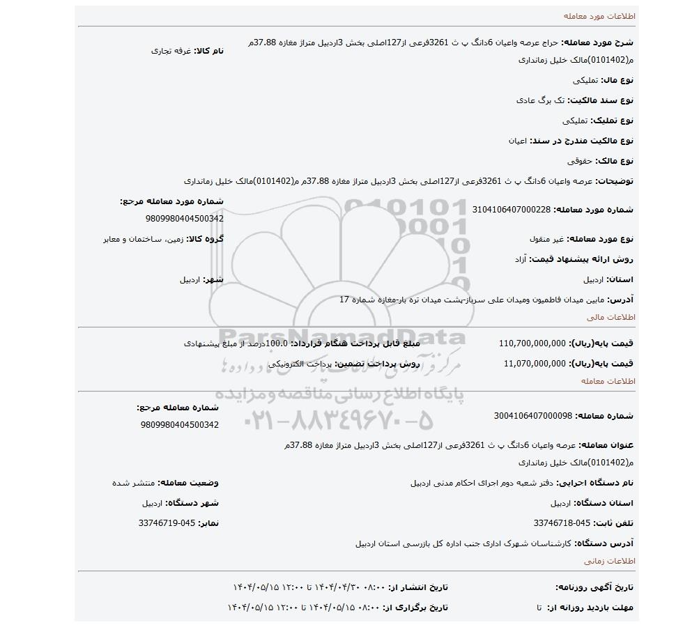 عنوان معامله: عرصه واعیان 6دانگ پ ث 3261فرعی از127اصلی بخش 3اردبیل متراژ مغازه 37.88م م(0101402)مالک خلیل زمانداری