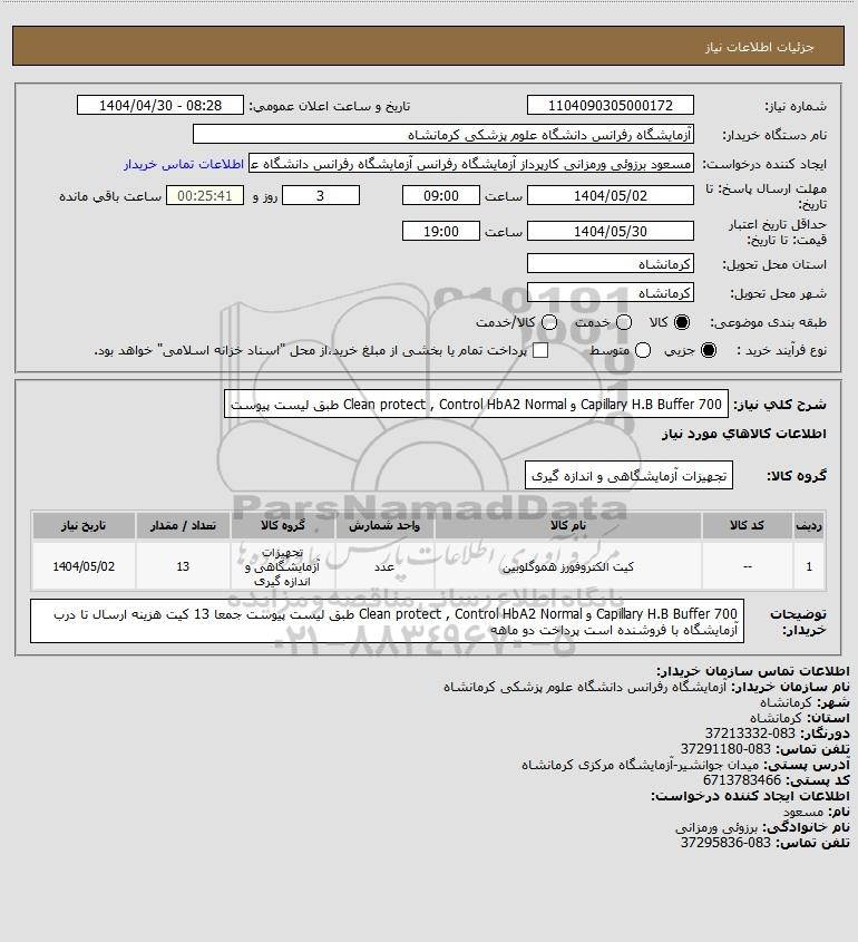 شرح کلی نیاز: Capillary H.B Buffer 700 و Clean protect , Control HbA2 Normal طبق لیست پیوست