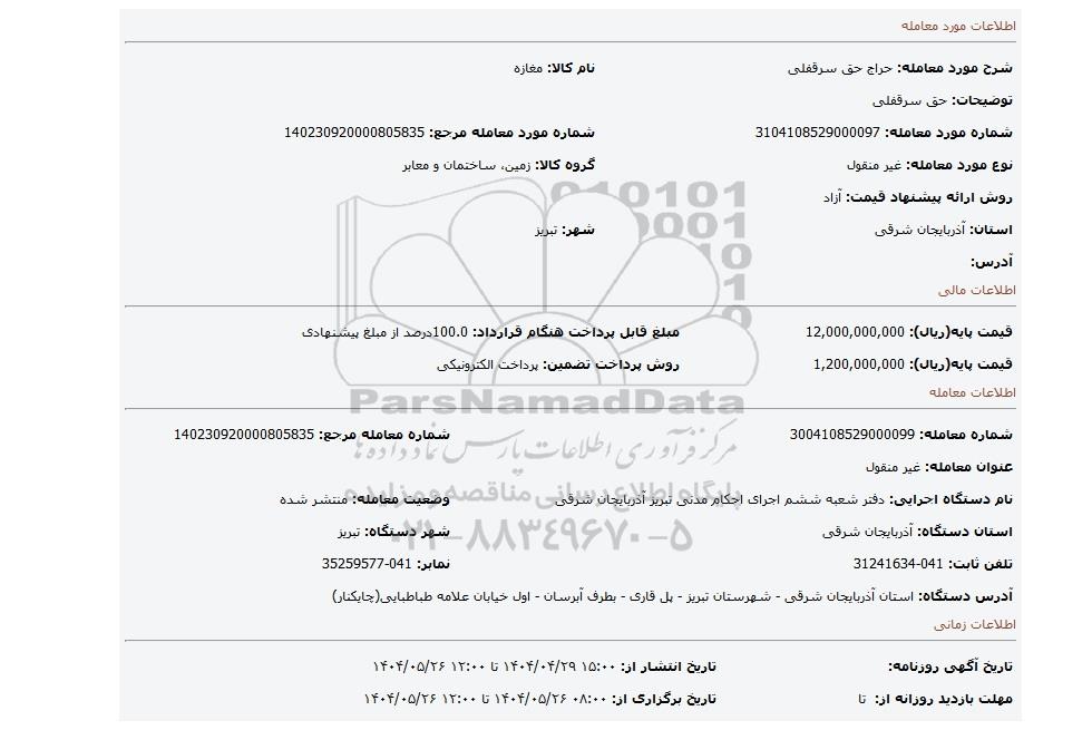مزایده عمومی مزایده حق سرقفلی برگزار میگردد. از کلیه افراد متخصص و شرکت‌های واجد شرایط دعوت به عمل می‌آید تا در این مزایده با کد خبرگزاری پارس نماد : 9299915 شرکت نمایند تاریخ شروع مزایده : 1404/04/29 مهلت شرکت در مزایده: تا پایان روز 1404/05/26 مکان برگزاری اموال واگذاری استان‌های آذربایجان شرقی و دسته‌بندی‌های مربوط به این حراجی ماشین آلات و تجهیزات کشاورزی و دام پروری, املاک و زمین میباشد. اطلاعات دقیق‌تر درباره شرایط شرکت در مزایده آنلاین و نحوه ارسال مدارک، الزامات پروژه و دریافت اسناد مزایده و تاریخ بازگشایی پاکت‌ها، در بخش اطلاعات تکمیلی این آگهی درج شده است.