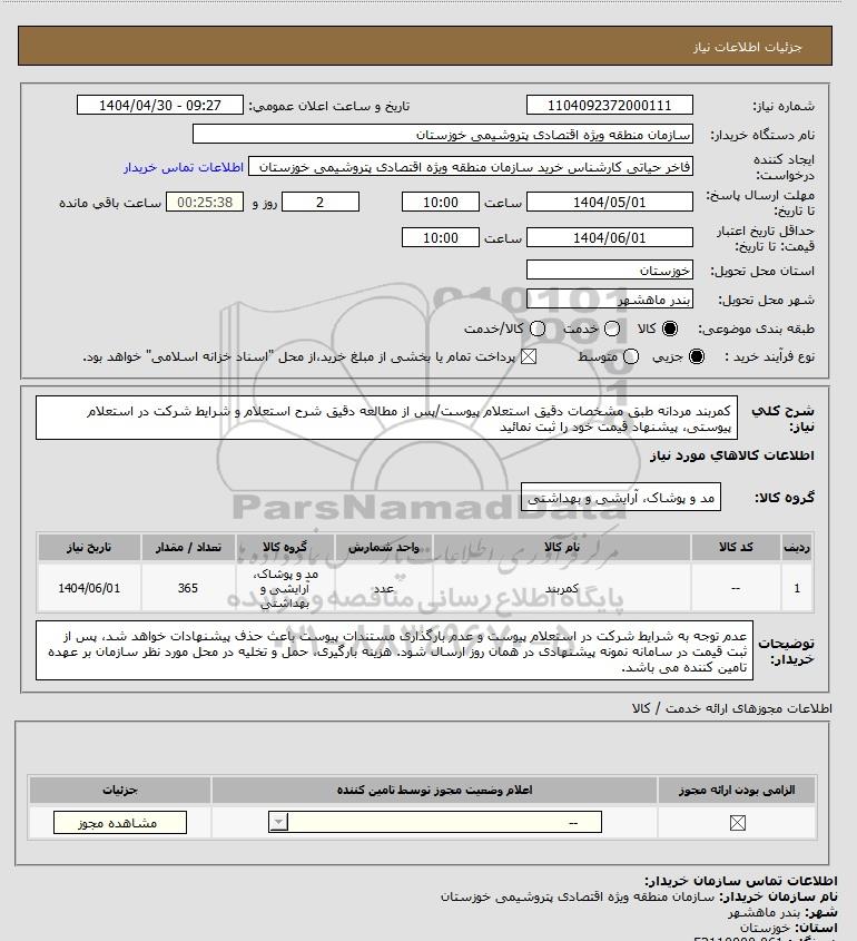 شرح کلی نیاز: کمربند مردانه طبق مشخصات دقیق استعلام پیوست/پس از مطالعه دقیق شرح استعلام و شرایط شرکت در استعلام پیوستی، پیشنهاد قیمت خود را ثبت نمائید