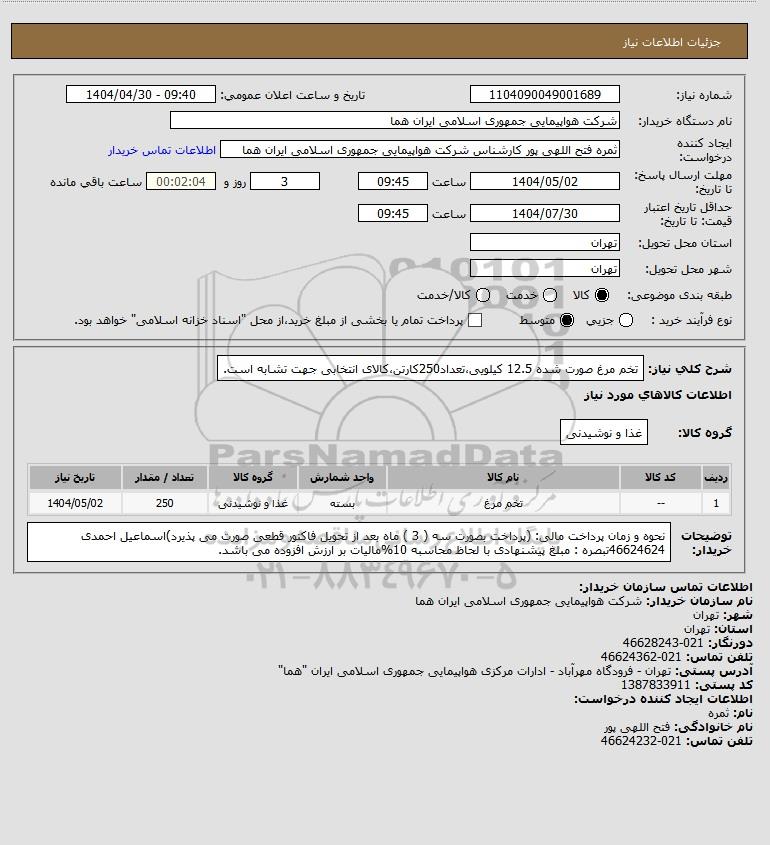 شرح کلی نیاز: تخم مرغ صورت شده 12.5 کیلویی،تعداد250کارتن،کالای انتخابی جهت تشابه است.
