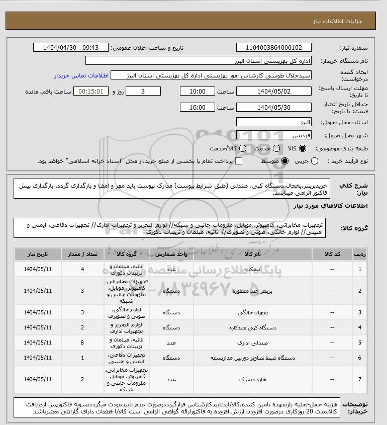 شرح کلی نیاز: خریدپرینتر،یخچال،دستگاه کپی، صندلی (طبق شرایط پیوست) مدارک پیوست باید مهر و امضا و بارگذاری گردد. بارگذاری پیش فاکتور الزامی میباشد.