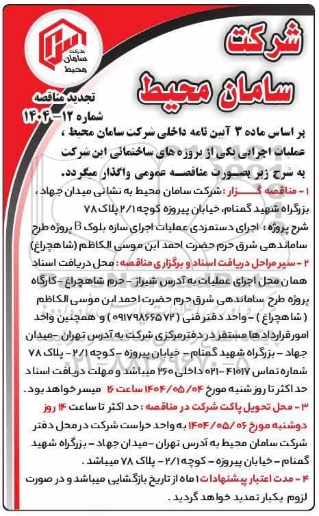 بر اساس ماده 3 آیین نامه داخلی شرکت سامان محیط ، عملیات اجرایی یکی از پروژه های ساختمانی این شرکت به شرح زیر بصورت مناقصه عمومی واگذار میگردد.