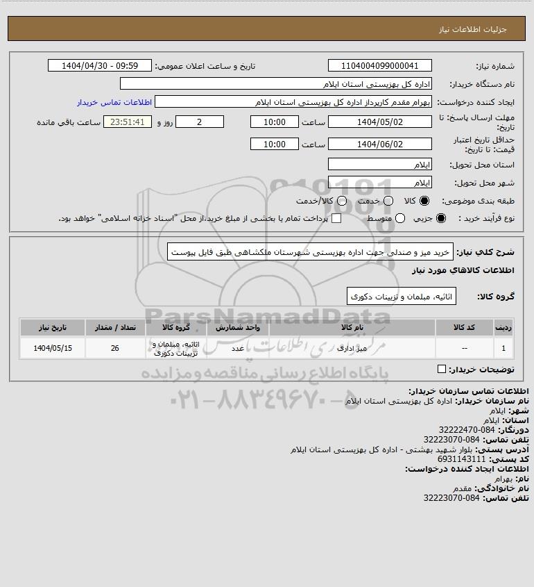 شرح کلی نیاز: خرید میز و صندلی جهت اداره بهزیستی شهرستان ملکشاهی طبق فایل پیوست