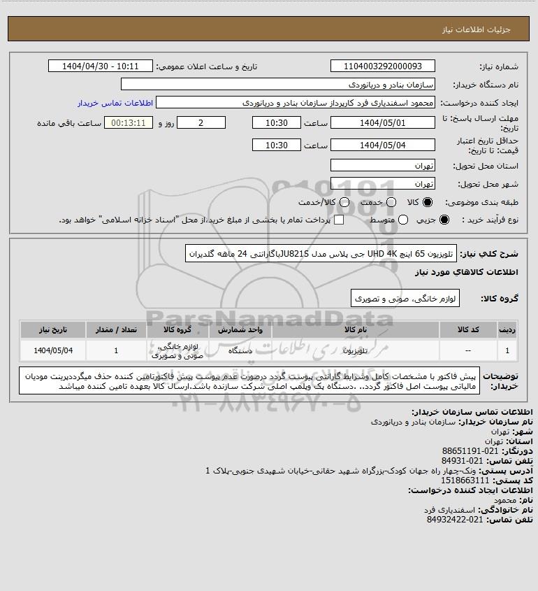 | 1 | -- | تلویزیون | دستگاه | لوازم خانگی، صوتی و تصویری | 1 | 1404/05/04 |