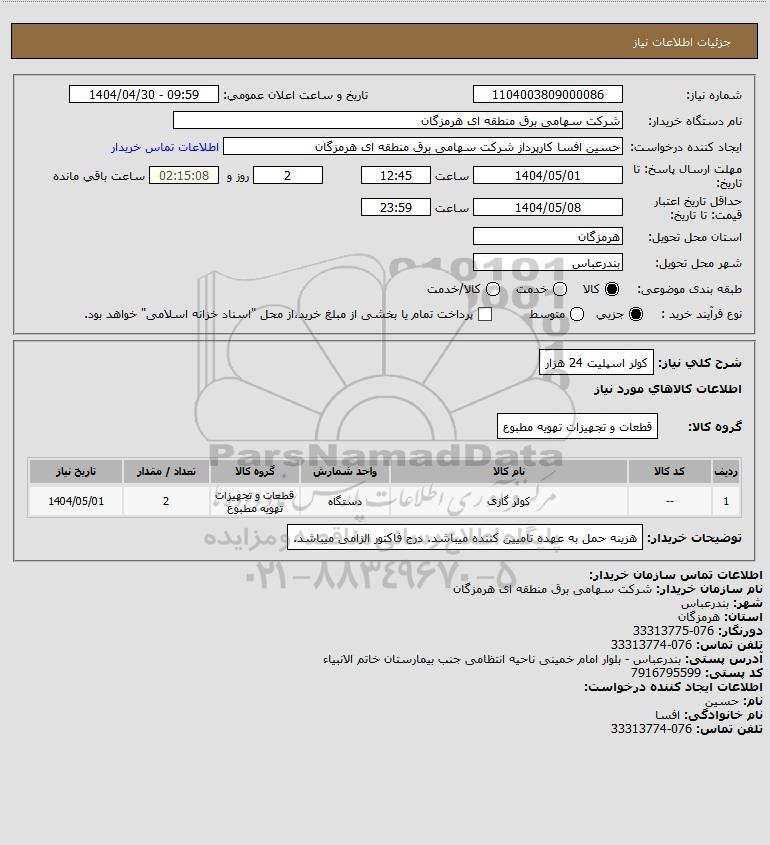 شرح کلی نیاز: کولر اسپلیت 24 هزار