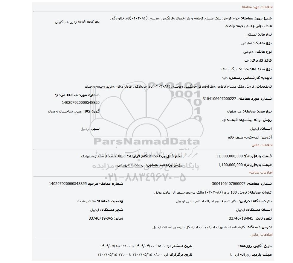 قیمت پایه(ریال): 1,100,000,000روش پرداخت تضمین: پرداخت الکترونیکی