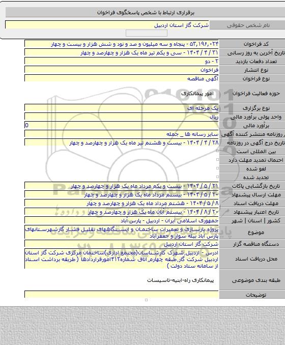پروژه بازسازی و تعمیرات ساختمان و ایستگاههای تقلیل فشار گازشهرستانهای پارس اباد بیله سوار و جعفراباد