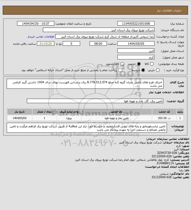 شرح کلی نیاز: اجرای طرح های ترانس بحران گروه 2به مبلغ 8.778.512.574 ریال براساس فهرست بهای سال 1404 داشتن گرید الزامی می باشد