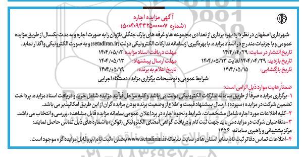 شهرداری اصفهان در نظر دارد بهره برداری از تعدادی مجموعه ها و غرفه های پارک جنگلی ناژوان را به صورت اجاره و به مدت یکسال از طریق مزایده عمومی و با جزئیات مندرج در اسناد مزایده با بهره گیری از سامانه تدارکات الکترونیکی دولت (ستاد ایران) و به صورت الکترونیکی واگذار نماید.