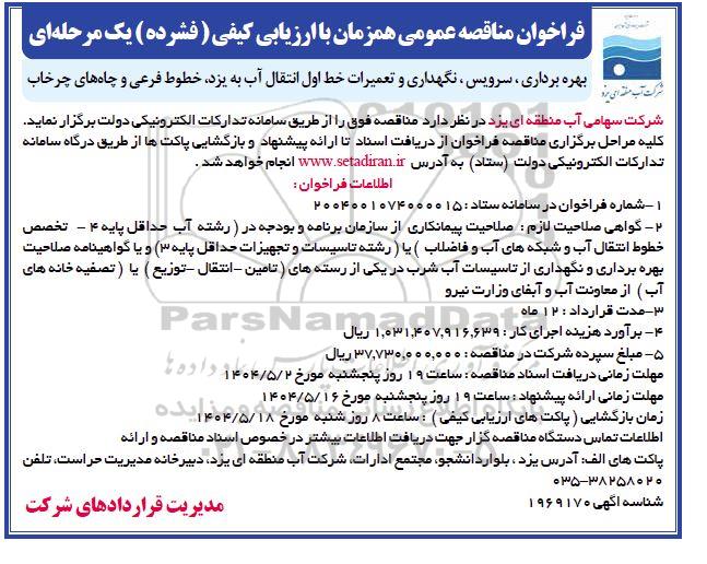 بهره برداری، سرویس ، نگهداری و تعمیرات خط اول انتقال آب به یزد خطوط فرعی و چاه های چرخاب