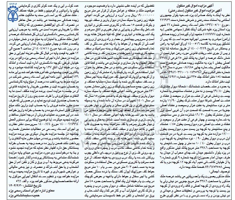 مزایده فروش ملک به پلاک ثبتی 25 فرعی از 7378 اصلی به صورت یک واحد ویلایی به مس احت 338.6 مترمربع