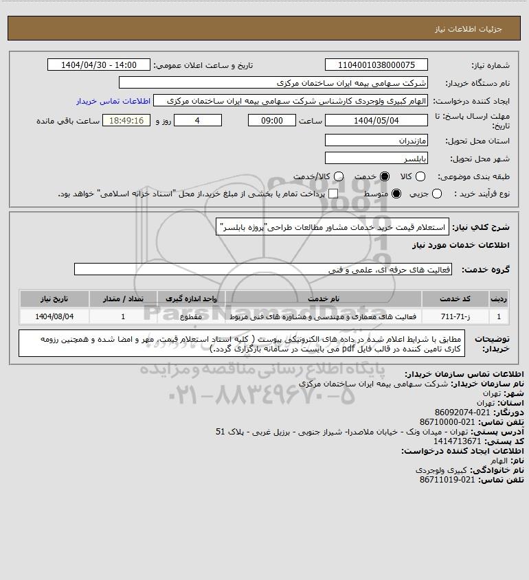 شرح کلی نیاز: استعلام قیمت خرید خدمات مشاور مطالعات طراحی"پروژه بابلسر"