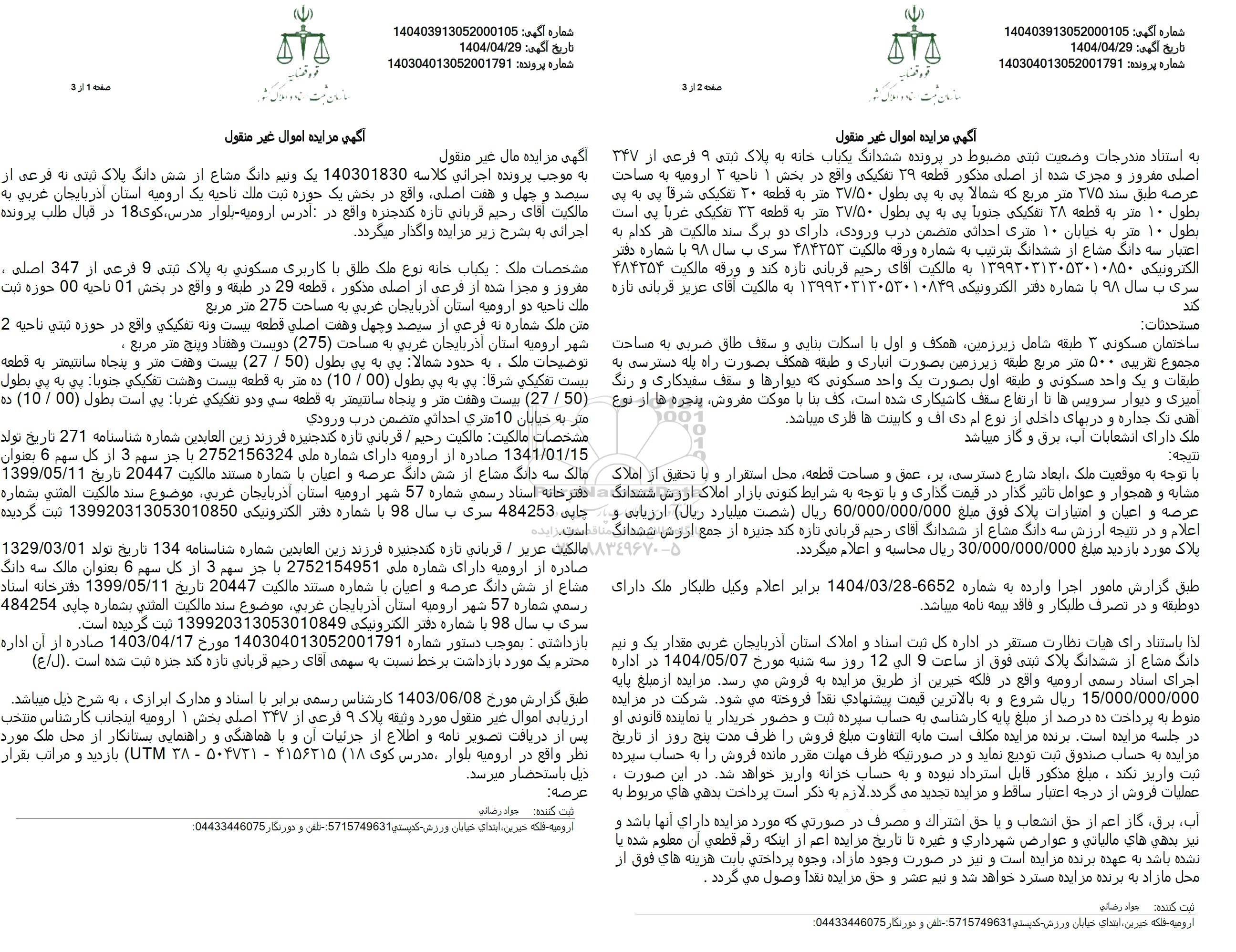 مزایده فروش یک باب خانه با پلاک ثبتی با پلاک ثبتی 9 فرعی از 347 اصلی