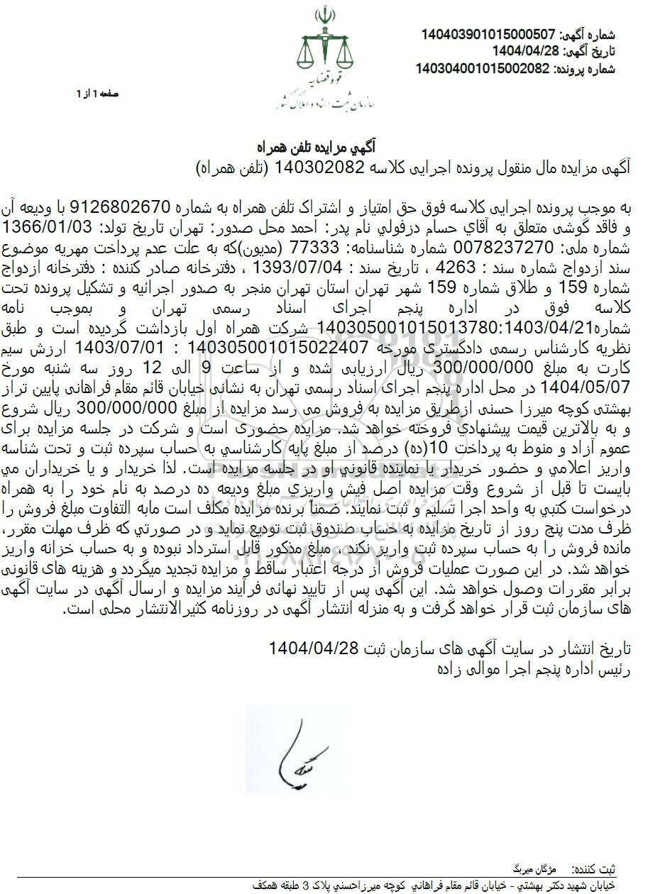 مزایده فروش اشتراک تلفن همراه به شماره 09126802670