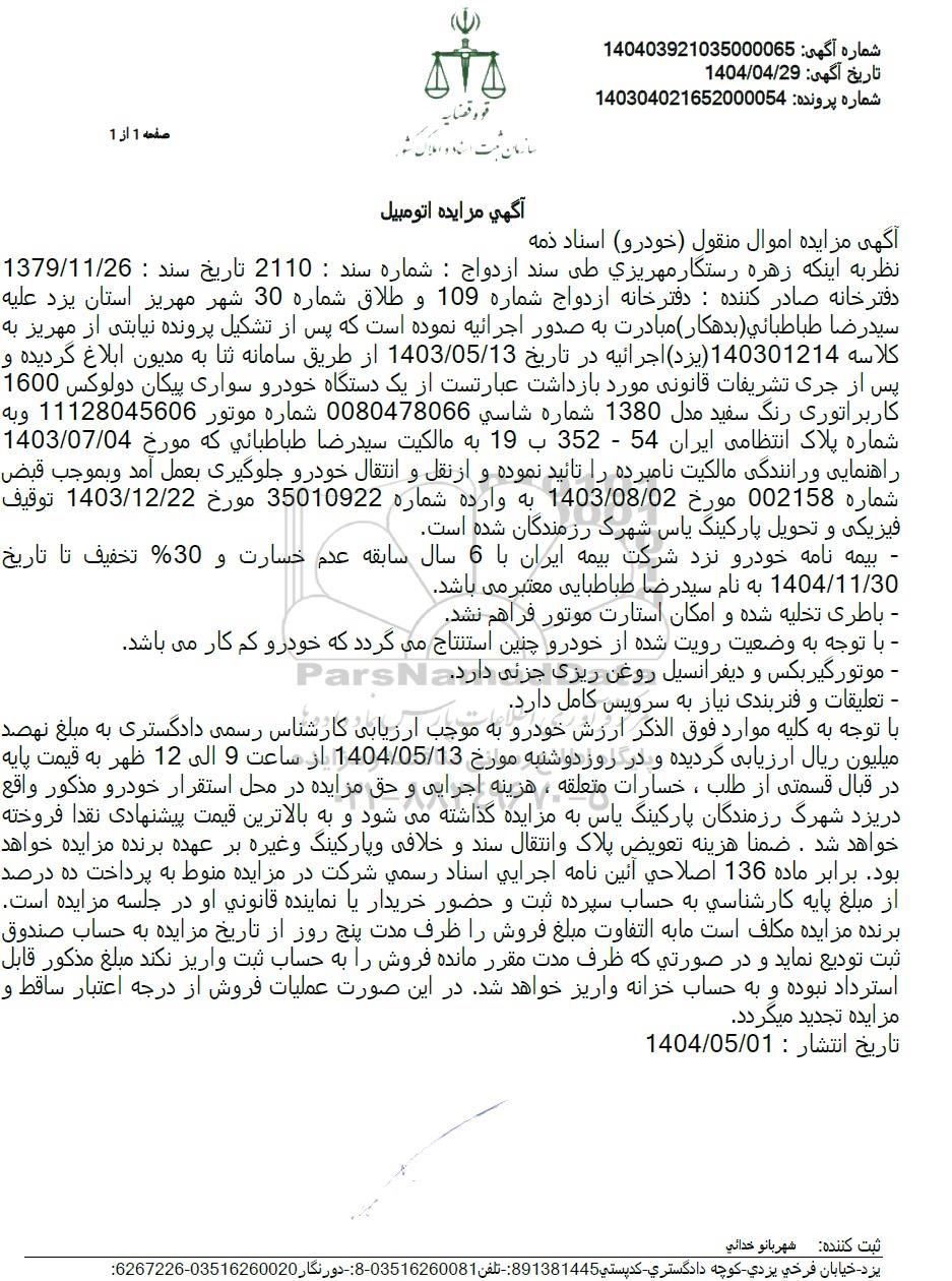 مزایده فروش یکدستگاه سواری پیکان دولوکس 1600 مدل 1380 به مبلغ نهصد میلیون ریال