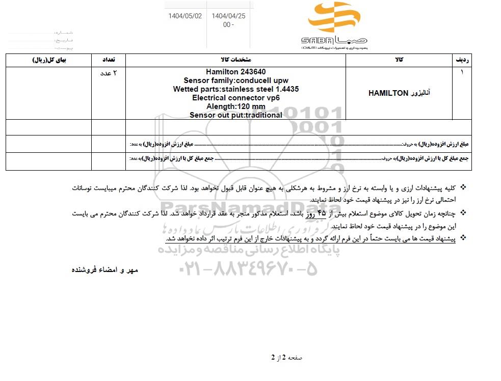 استعلام بها و موضوع استعلام استعلام آنالیزور HAMILTON به اطلاع کلیه شرکتها و افراد متخصص واجد شرایط میرساند، آگهی گذار در نظر دارد از طریق استعلام بها، نسبت به انتخاب و دریافت پیشنهادات اقدام نماید. این استعلام با کد آگهی ثبت شده در سامانه خبرگزاری پارس نماد : 9303426 منتشر شده است. مشخصات استعلام : تاریخ شروع استعلام: 1404/04/30 آخرین مهلت ارسال پیشنهاد قیمت : 1404/05/02 و محل اجرای پروژه : استان سایر میباشد. استعلام قیمت مورد درخواست : استعلام آنالیزور HAMILTON با دستهبندیهای تخصصی و گروه های مرتبط : ابزار دقیق, خدمات و تجهیزات آزمایشگاهی و پزشکی, نیروگاه, تجهیزات برق و الکترونیک, استعلام اطلاع رسانی میگردد. شرایط شرکت در استعلام آنلاین : ابتدا ثبت نام در سامانه استعلام پارس نماد و تکمیل مدارک موردنیاز و بارگذاری در سامانه رعایت تمامی ضوابط و الزامات مندرج در اسناد استعلام است.