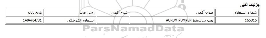 | 165315 | پمپ سانتریفوژ AURUM PUMPEN | استعلام الکترونیکی | 1404/04/31 |