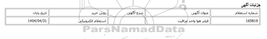 | 165819 | فیلتر هوا واحد مراقبت | استعلام الکترونیکی | 1404/04/31 |