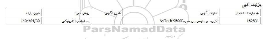 | 162831 | کیبورد و ماوس بی سیمA4Tech 9500F | استعلام الکترونیکی | 1404/04/30 |