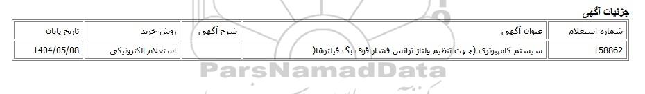 | 158862 | سیستم کامپیوتری (جهت تنظیم ولتاژ ترانس فشار قوی بگ فیلترها( | استعلام الکترونیکی | 1404/05/08 |