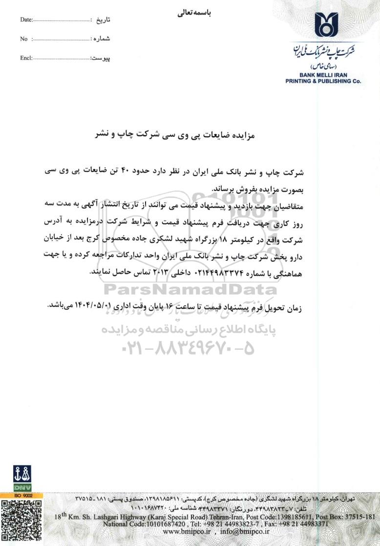 شرکت چاپ و نشر بانک ملی ایران در نظر دارد حدود 40 تن ضایعات پی وی سی بصورت مزایده بفروش برساند.
