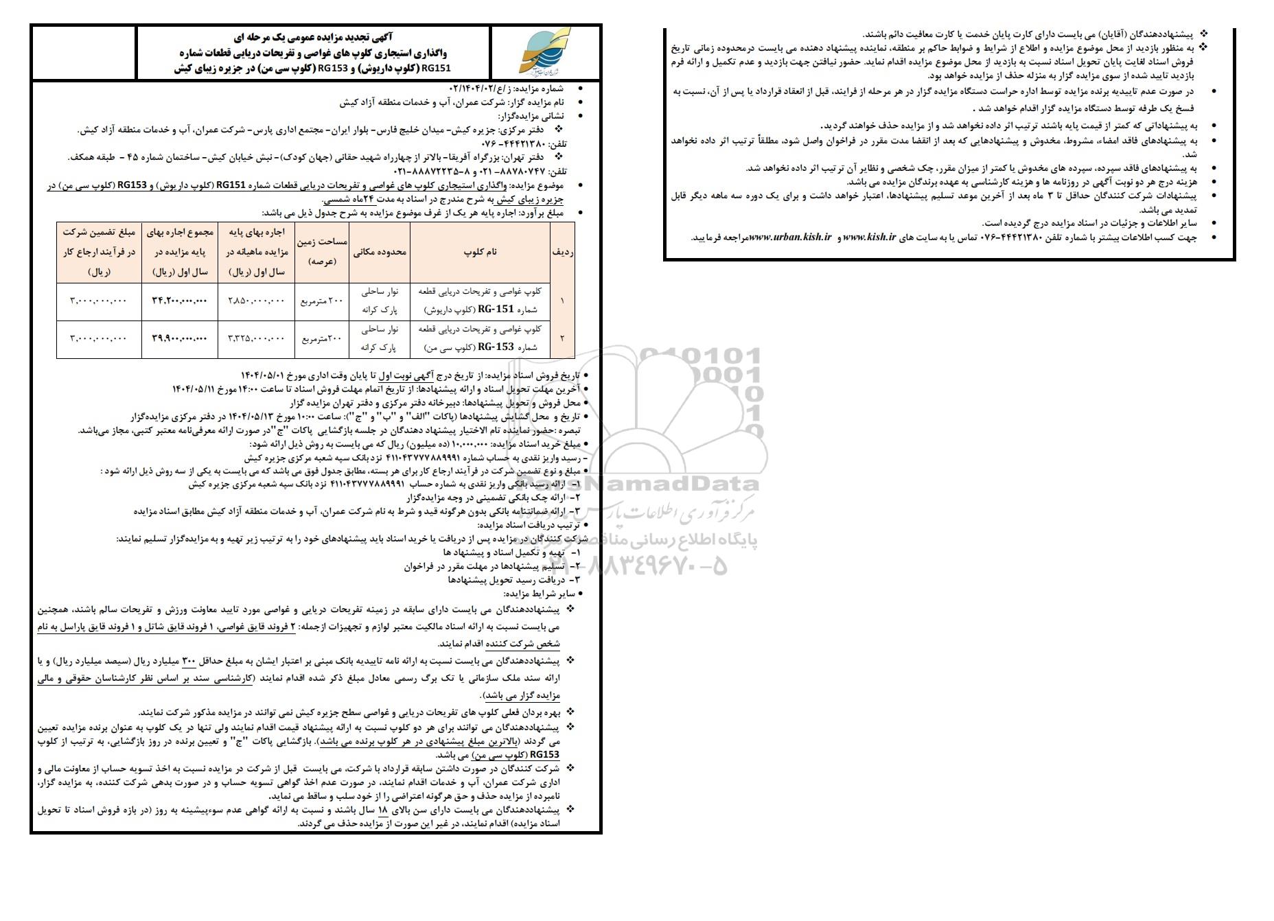 واگذاری استیجاری کلوپ های غواصی و تفریحات دریایی قطعات شماره  RG151 (کلوپ داریوش) و RG153 (کلوپ سی من) در جزیره زیبای کیش