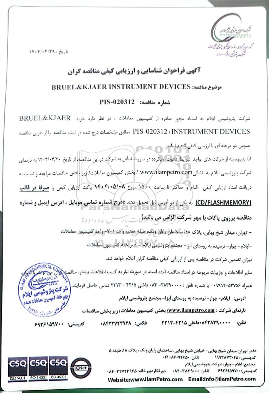 شرکت پتروشیمی ایلام به استناد مجوز صادره از کمیسیون معاملات، در نظر دارد خرید BRUEL&KJAER INSTRUMENT DEVICES /   PIS - 020312 مطابق مشخصات درج شده در اسناد مناقصه را از طریق مناقصه عمومی دو مرحله ای با ارزیابی کیفی انجام نماید.