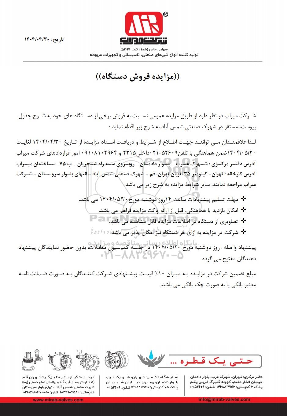 شرکت میراب در نظر دارد از طریق مزایده عمومی نسبت به فروش برخی از دستگاه های خود به شرح جدول پیوست، مستقر در شهرک صنعتی شمس آباد به شرح زیر اقدام نماید :
